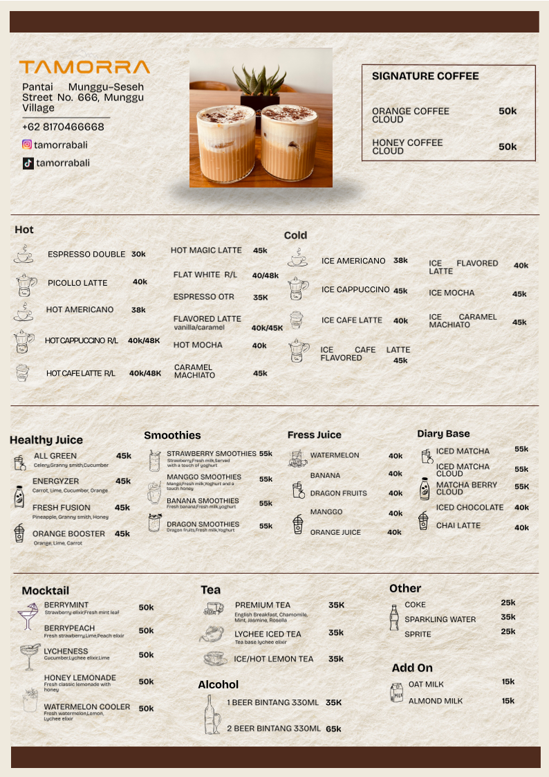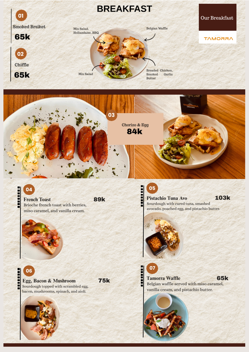 Brand Concept Tamorra Coffee & Eatery is a modern café that celebrates the richness of Indonesian coffee beans combined with comforting Western cuisine and asian Food . We create a warm, stylish, and welcoming space for both locals and international guests.